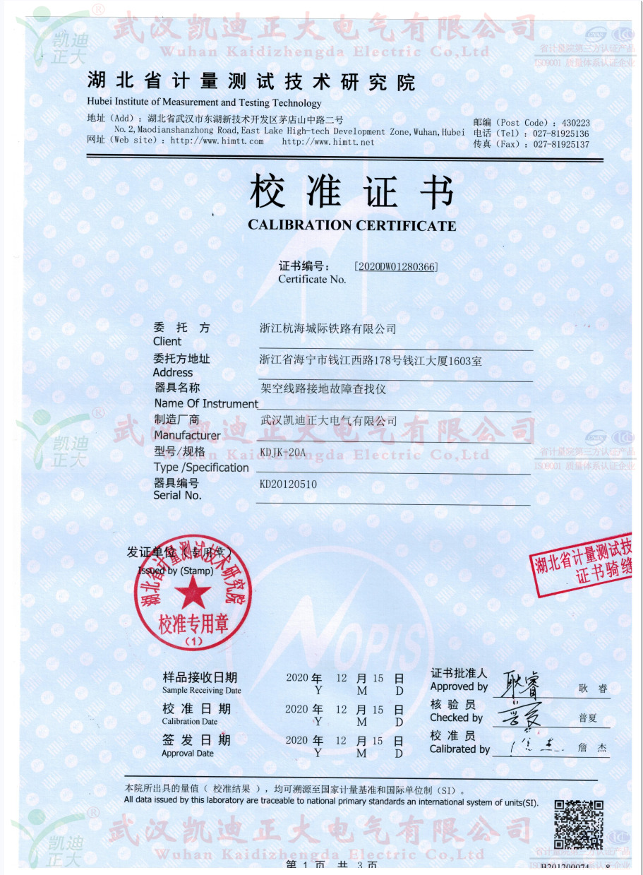 KDJK-20A架空線路接地故障查找儀獲得湖北計量院校準證書