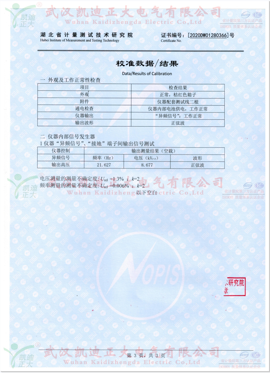 繼我司抽檢10套KDJK-10A配網單相接地故障定位儀送往湖北省計量測試技術研究院校準,此次獲得電學所檢測設備DS0S054A數字示波器標準設備的數據:輸出波形正玄波、異頻信號21.627Hz、輸出電壓8.677kV、頻率測量的不確定度0.006%。符合武漢凱迪正大公司和國家電力規程標準。同時獲得科學技術部火炬高技術產業開發中心、武漢市科技局認定武漢市創新產品證書。