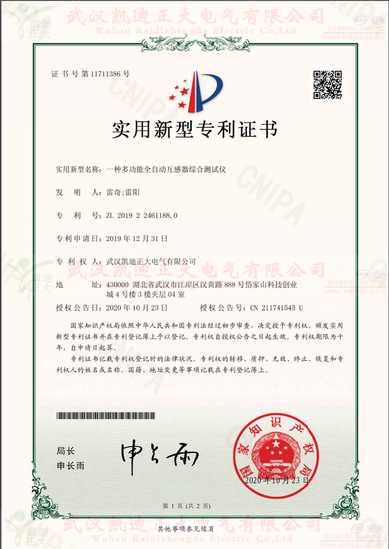 好消息!近日,凱迪正大再次獲得了5項實用新型專利證書!實用新型名稱是一種新型高壓開關(guān)特性測試儀、一種便于移動的電纜故障高壓測試儀、一種智能型絕緣電阻測試儀、一種工頻交流耐壓試驗裝置、和一種多功能自動互感器綜合測試儀專利證書。公司高級工程師與軟件工程師的智慧交融為企業(yè)榮譽(yù)再添輝煌。