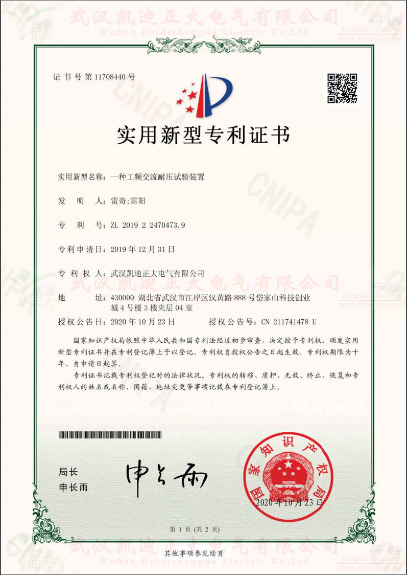 3、一種工頻交流耐壓試驗裝置。證書號第11708440號,專利號:ZL 2019 2 2470473.9,發(fā)明人:雷奇;雷陽,專利權(quán)人:武漢凱迪正大電氣有限公司,授權(quán)公告號:CN 211741478 U。