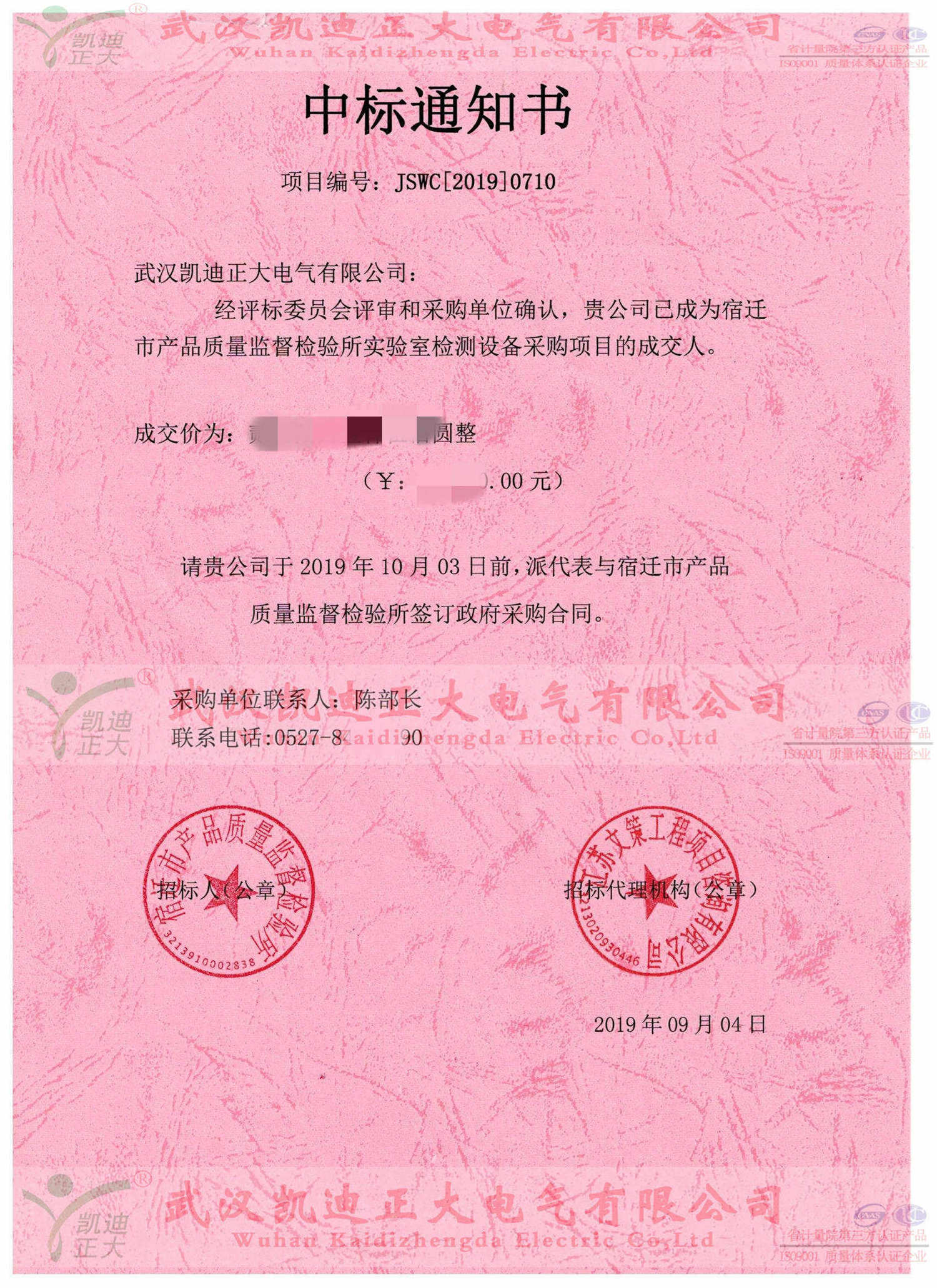 2019年9月份,受邀參與隸屬于宿遷市質(zhì)量技術(shù)監(jiān)督局的宿遷市產(chǎn)品質(zhì)量監(jiān)督檢驗(yàn)所實(shí)驗(yàn)室檢測(cè)設(shè)備采購(gòu)項(xiàng)目,并以最高分獲得中標(biāo)人。因武漢疫情等影響昨日收到宿遷質(zhì)檢所的中標(biāo)通知書。