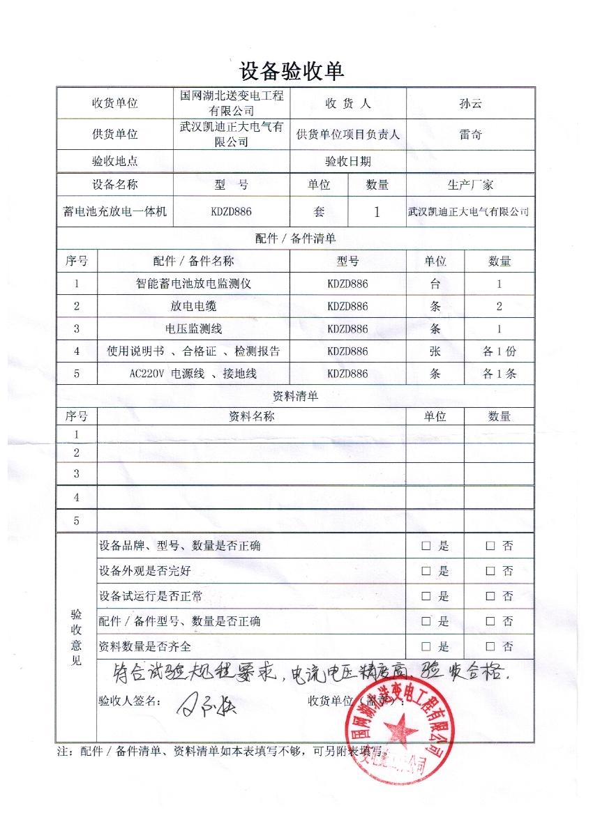 就在前幾日國(guó)網(wǎng)湖北送變工程有限公司采供了我司KDZD886蓄電池充放電一體機(jī)一套,并且驗(yàn)收成功,驗(yàn)收結(jié)果也達(dá)到試驗(yàn)規(guī)程要求,電流電壓精度都很高,驗(yàn)收結(jié)果表示很滿意!KDZD886蓄電池充放電一體機(jī)主要配件有KDZD886智能蓄電池檢測(cè)儀1臺(tái),KDZD886放電電纜2條,KDZD886電壓檢測(cè)線1條,使用說(shuō)明書,合格正,檢測(cè)報(bào)告各一份,KDZD886 AC220V電源線,接地線各一條,湖北省送變電工程公司是湖北省電力公司的合資子公司,隸屬于國(guó)家電網(wǎng)公司,是一家從事輸變電工程施工的省級(jí)專業(yè)公司,具有國(guó)家電力工程施工總承包壹級(jí)企業(yè)資質(zhì)和一級(jí)承裝(修、試)電力設(shè)施許可證;通過(guò)了國(guó)家質(zhì)量管理體系、環(huán)境管理體系和職業(yè)健康安全管理體系的認(rèn)證?,F(xiàn)有職工2076人,具有中高級(jí)專業(yè)技術(shù)資格人員219人。