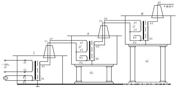 串級試驗變壓器的接線如下圖: