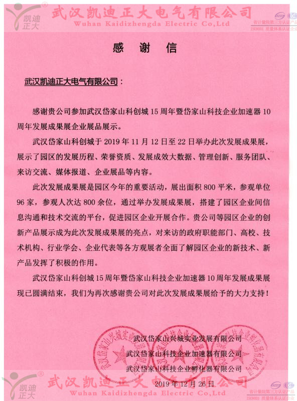 年關(guān)將至,凱迪正大公司收到一份來自岱家山科技企業(yè)加速器公司的感謝信,感謝我司的創(chuàng)新產(chǎn)品展示成為發(fā)展成果展的亮點。此次我司參展的創(chuàng)新產(chǎn)品有:KDHG-518B變頻互感器特性綜合測試儀、KDVLF-80kV超低頻交流耐壓試驗裝置、KDJB-1200微機(jī)繼電保護(hù)測試儀等設(shè)備。來訪的政府職能部門、高校、技術(shù)機(jī)構(gòu)、行業(yè)協(xié)會、企業(yè)代表等參觀者共同見證了我們公司新產(chǎn)品的新技術(shù)。