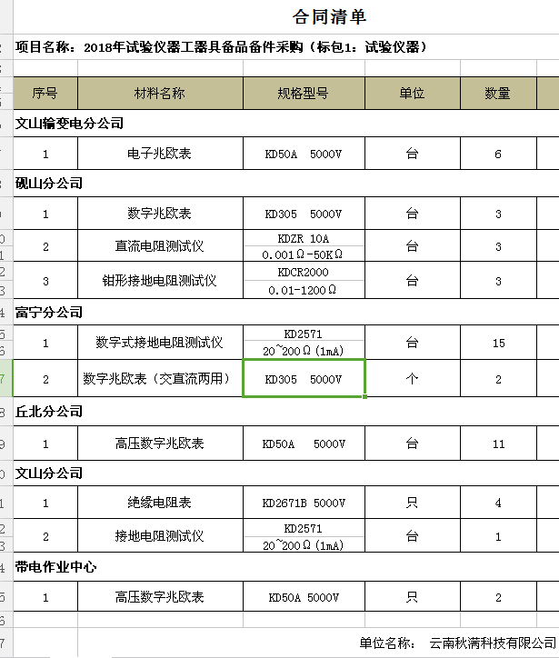 隨即,云南文山電力股份有限公司在我司生產的KD50A電子兆歐表,KD305數字兆歐表,KDZR-10A直流電阻測試儀,KDCR2000鉗形接地電阻測試儀,KD2671絕緣搖表,KD2571接地電阻測試儀等設備參數中看中優于同行業電氣廠家的性能,價格優勢、售后服務、良好的市場口碑判定中標人云南秋滿公司。