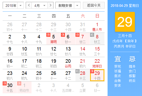2018年五一放假安排時間表最新國務院官方發布: 4月29日(星期天)至5月1日(勞動節,星期二)放假調休,共3天。 友情提示:4月28日(星期六)上班。