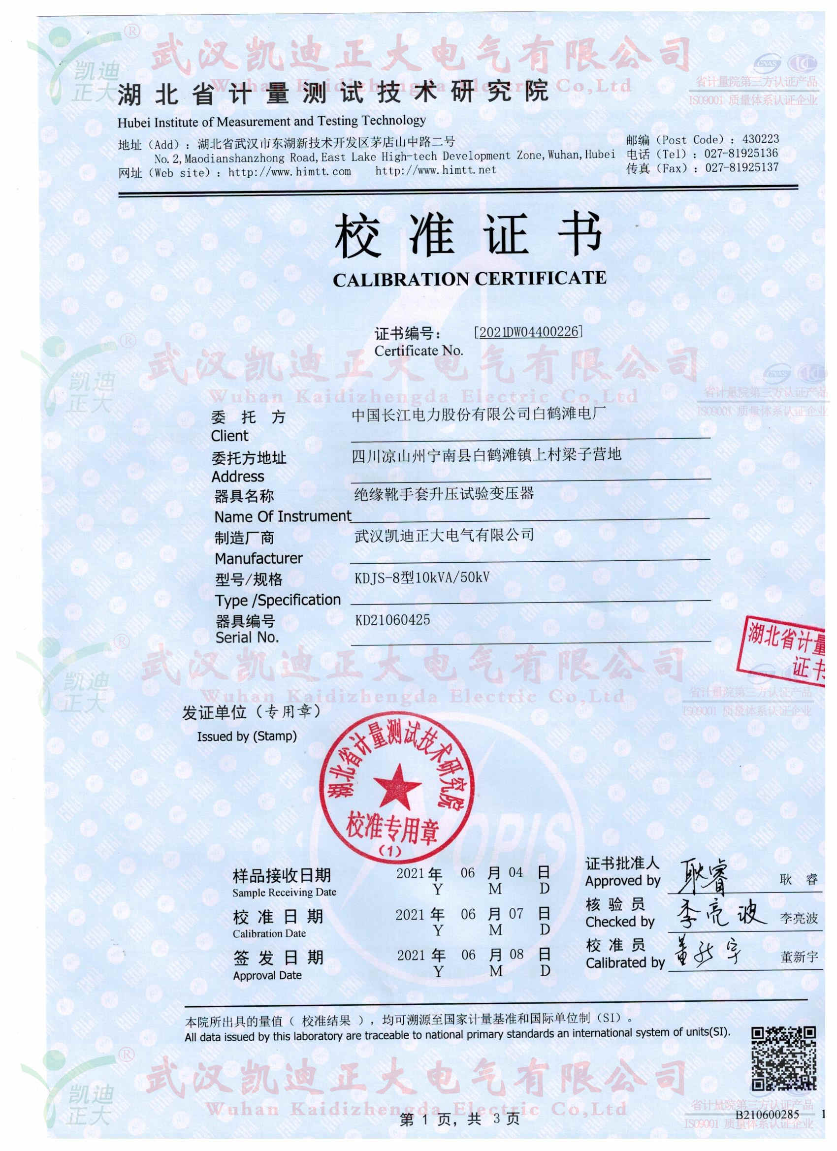 KDJS-8自動絕緣靴手套耐壓泄漏電流測試儀獲得湖北省計量測試技術研究院校準證書,證書編號《2021DW04400226》,采用FRC-150M數字高壓表檢定電壓合格、產品各項指標均符合國標的要求。按《電力安全工器具預防性試驗規程》要求對絕緣鞋、絕緣手套等安全工器具進行智能化絕緣耐壓試驗,絕緣靴及絕緣手套耐試驗周期為半年,試驗過程中不允許擊穿,同時絕緣靴絕緣絕緣手套泄漏電流不大于限定值。產品適用于大多數與電力相關行業。