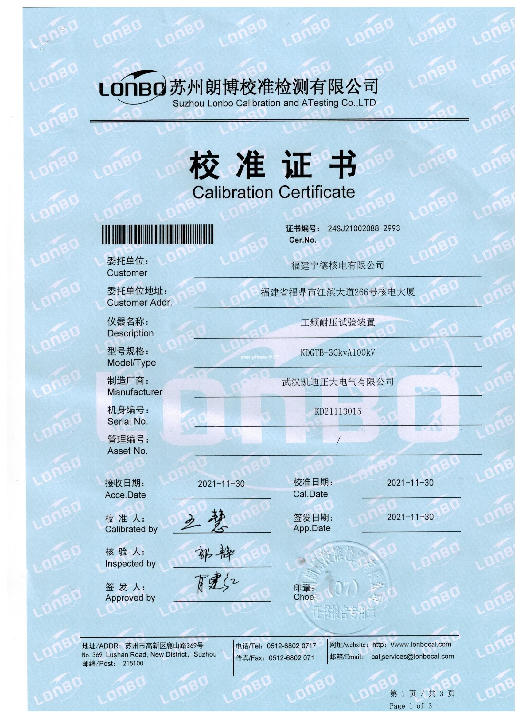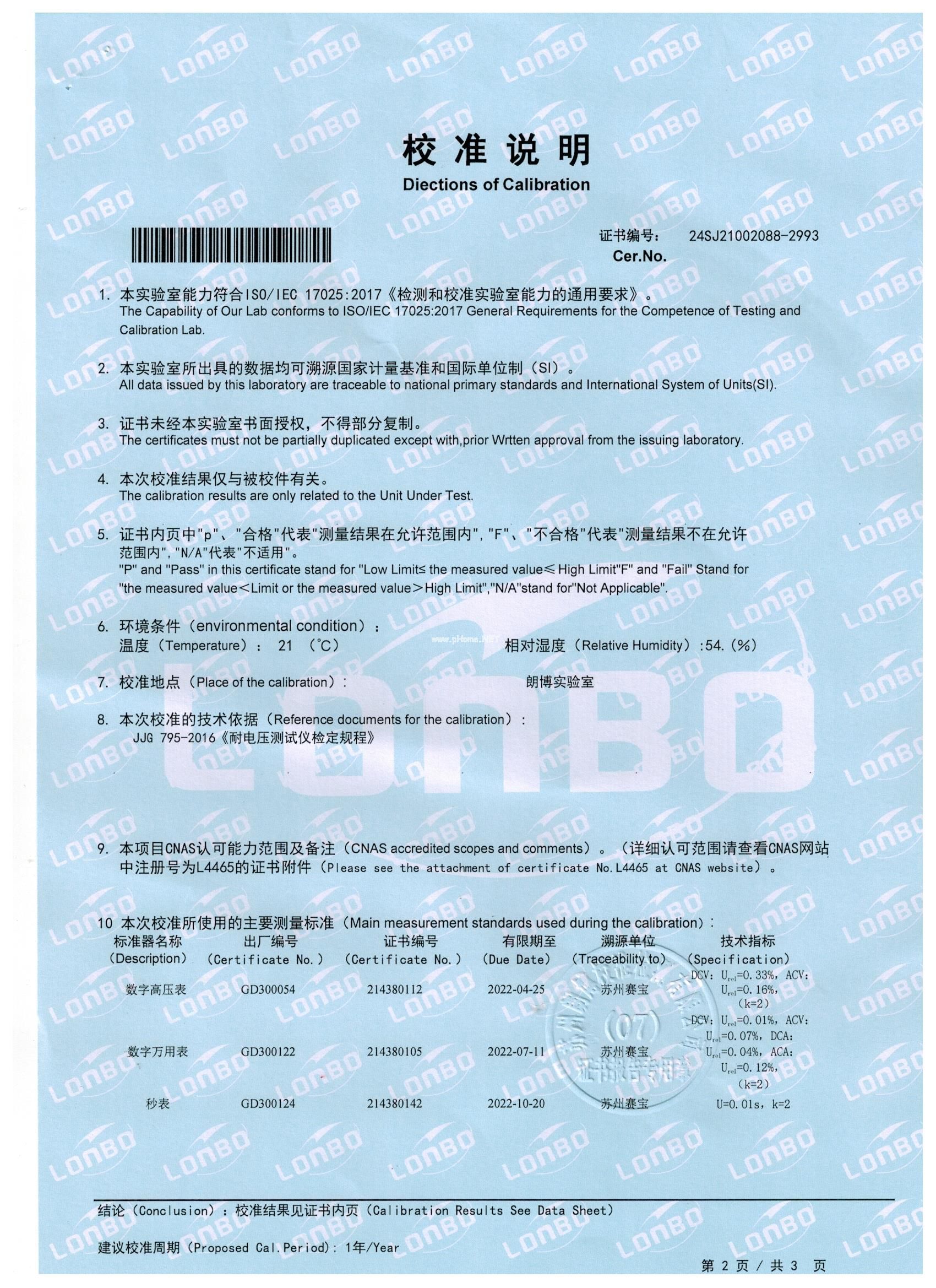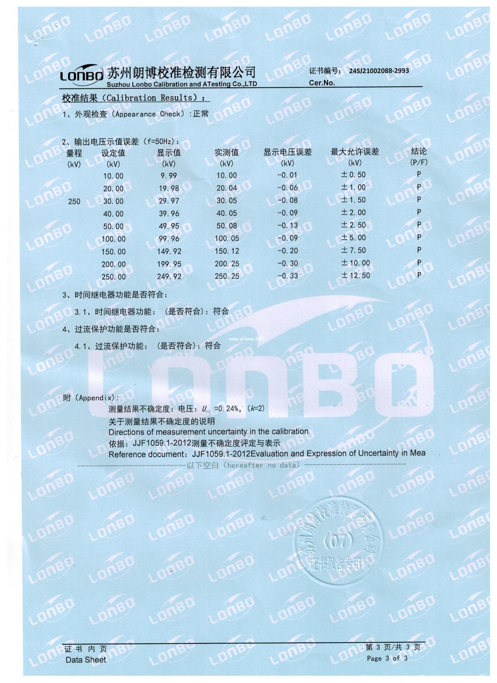工頻耐壓試驗裝置,并由甲方委托蘇州朗博校準檢測有限公司出具檢測報告。