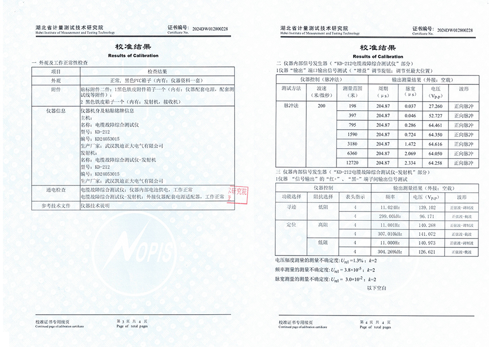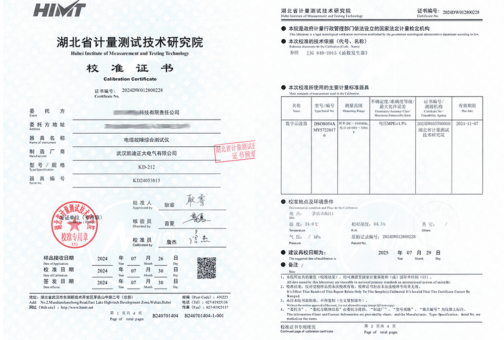 值得強調的是,KD-212電纜故障綜合測試儀不僅贏得了河北地震局認可,還順利通過了湖北省計量測試技術研究院的嚴格檢測,獲得了校準證書,這再次證明了其技術水平和測量結果的準確性。