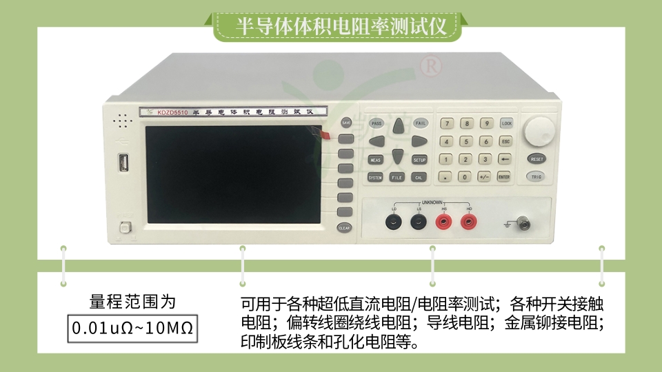 KDZD5510半導體體積電阻率測試儀可用于電線電纜、分流器、金屬、導體等各種超低直流電阻/電阻率測試。也可測量各種開關接觸電阻;接插件接觸電阻;繼電器線包和觸點電阻;變壓器、電感器、電機、偏轉(zhuǎn)線圈繞線電阻(感性負載請選用單向電流模式測試);導線電阻;車、船、飛機的金屬鉚接電阻;印制板線條和孔化電阻等。