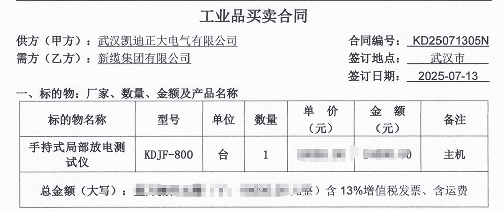 2025年7月13日,電力設(shè)備制造商新纜集團(tuán)有限公司采購了武漢凱迪正大電氣有限公司的KDJF-800局部放電檢測儀,這彰顯了武漢凱迪正大在局部放電檢測領(lǐng)域的專業(yè)實(shí)力和市場地位。