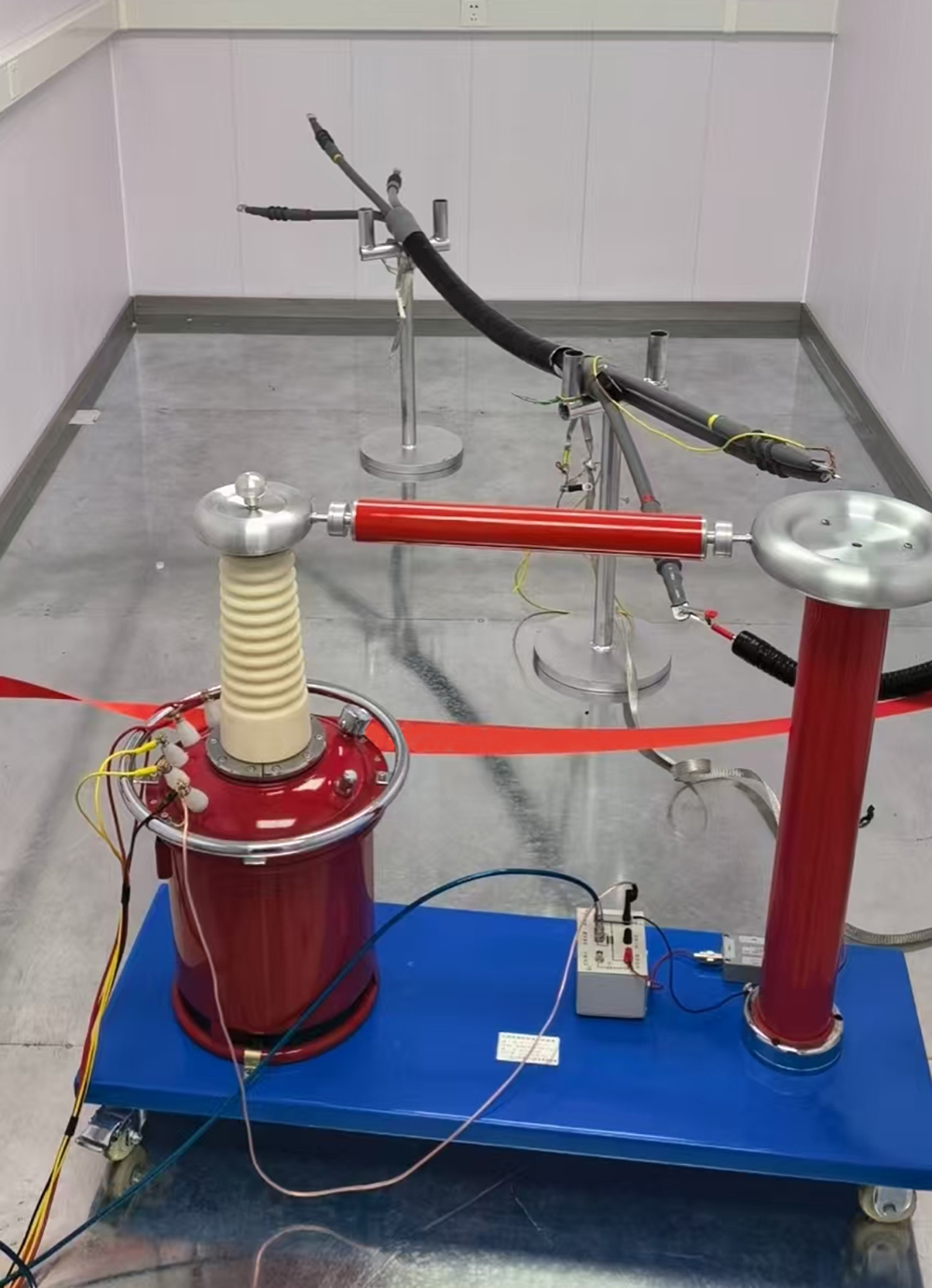 屏蔽室內(nèi)尺寸為長5米×寬4米×高2.45米,配置了電動平移屏蔽門和手動單開屏蔽門,方便人員和設(shè)備進(jìn)出。室內(nèi)還安裝了通風(fēng)截止波導(dǎo)窗和電源濾波器等設(shè)備,有效隔離了外部電磁干擾和電源干擾。同時(shí),屏蔽室內(nèi)還配置了無電磁干擾的LED長管燈和接地系統(tǒng)等設(shè)施,為局部放電試驗(yàn)提供了一個(gè)安全、舒適、可靠的測試環(huán)境。